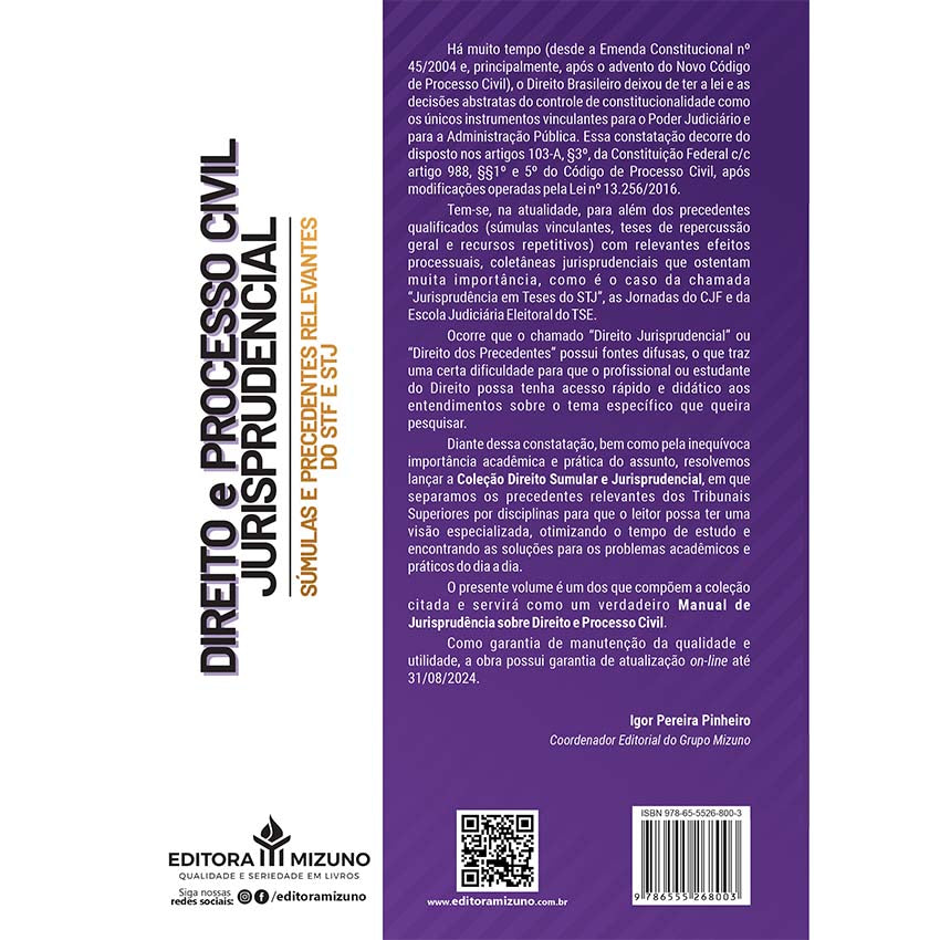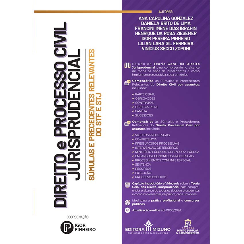 Neste contexto, o livro "Direito e Processo Civil Jurisprudencial - Súmulas e Precedentes Relevantes do STF e STJ", publicado pela Editora Mizuno, emerge como uma obra indispensável para profissionais e estudantes que buscam uma compreensão profunda e aplicada das nuances do Direito e Processo Civil contemporâneos. Organizado por Igor Pereira Pinheiro e com contribuições de renomados autores como Ana Carolina, Daniela Brito de Lima, Francini Imene Dias Ibrahin, Henrique da Rosa Ziesemer, Lilian Lara Gil Ferreira, e Vinícius Secco Zoponi, este volume se posiciona como um vade mecum de jurisprudência e um manual de jurisprudência fundamental.