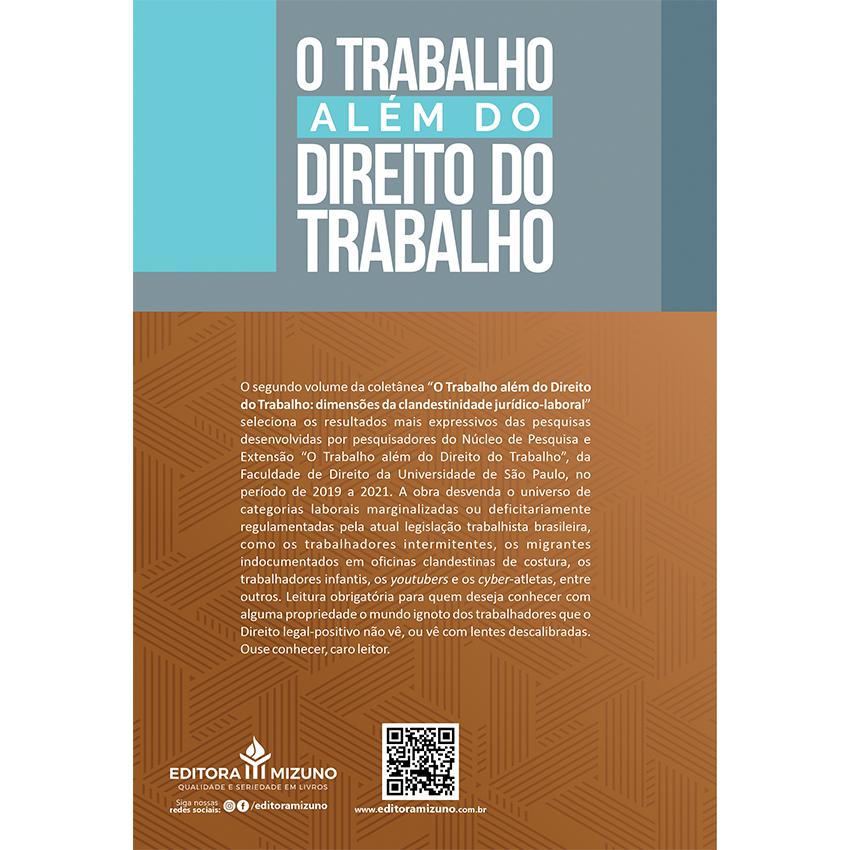 Sinopse: O segundo volume da coletânea “O Trabalho além do Direito do Trabalho: dimensões da clandestinidade jurídico-laboral” seleciona os resultados mais expressivos das pesquisas desenvolvidas por pesquisadores do Núcleo de Pesquisa e Extensão “O Trabalho além do Direito do Trabalho”, da Faculdade de Direito da Universidade de São Paulo, no período de 2019 a 2021. A obra desvenda o universo de categorias laborais marginalizadas ou deficitariamente regulamentadas pela atual legislação trabalhista brasileira, como os trabalhadores intermitentes, os migrantes indocumentados em oficinas clandestinas de costura, os trabalhadores infantis, os youtubers e os cyber-atletas, entre outros. Leitura obrigatória para quem deseja conhecer com alguma propriedade o mundo ignoto dos trabalhadores que o Direito legal-positivo não vê, ou vê com lentes descalibradas. Ouse conhecer, caro leitor.