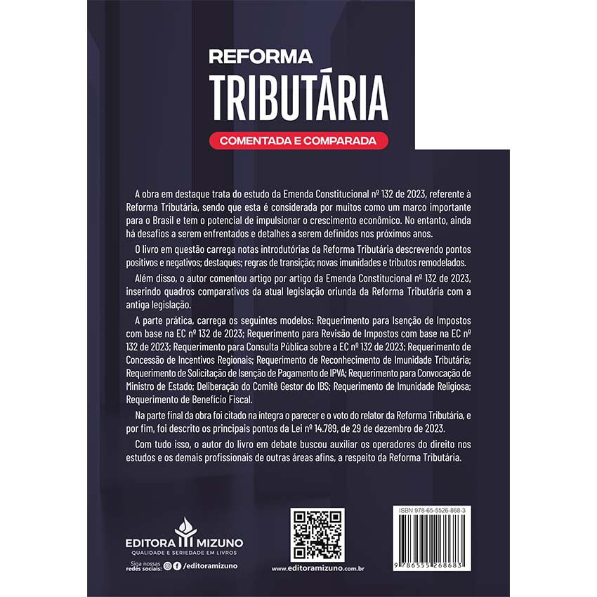 Além disso, o autor comentou artigo por artigo da Emenda Constitucional nº 132 de 2023, inserindo quadros comparativos da atual legislação oriunda da Reforma Tributária com a antiga legislação.