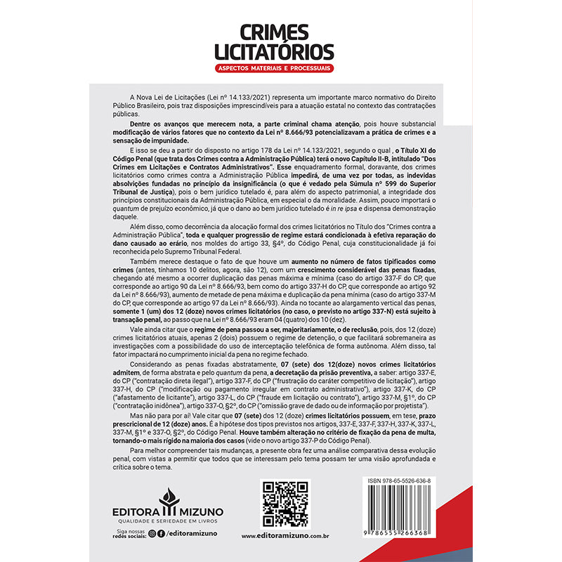 Mas não para por aí! Vale citar que 07 (sete) dos 12 (doze) crimes licitatórios possuem, em tese, prazo prescricional de 12 (doze) anos. É a hipótese dos tipos previstos nos artigos, 337-E, 337-F, 337-H, 337-K, 337-L, 337-M, §1º e 337-O, §2º, do Código Penal. Houve também alteração no critério de fixação da pena de multa, tornando-o mais rígido na maioria dos casos (vide o novo artigo 337-P do Código Penal). Para melhor compreender tais mudanças, a presente obra fez uma análise comparativa dessa evolução penal, com vistas a permitir que todos que se interessam pelo tema possam ter uma visão aprofundada e crítica sobre o tema.