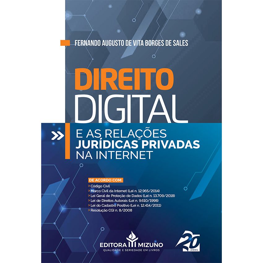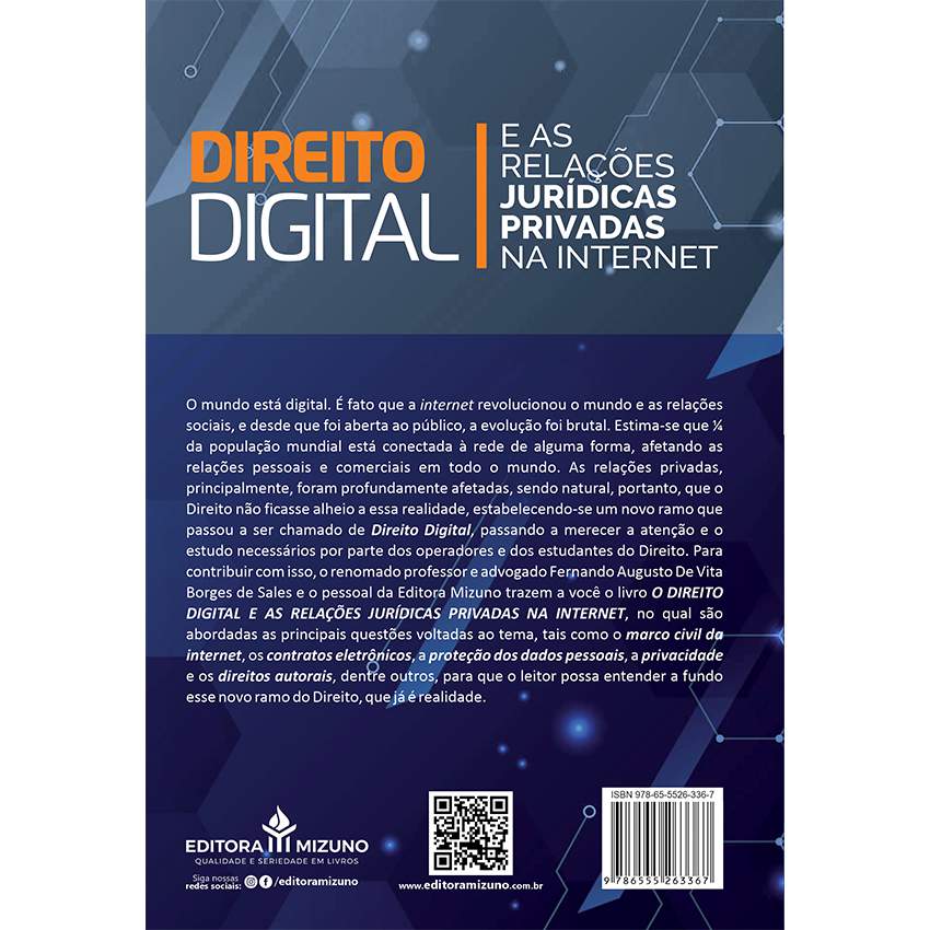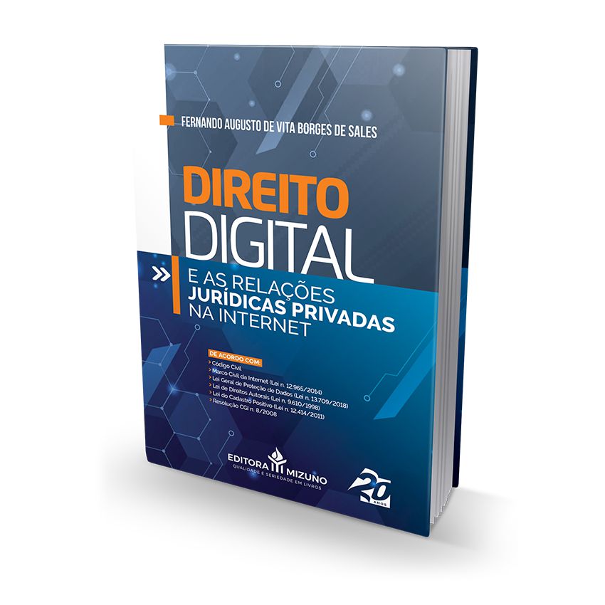 Sinopse: O mundo está digital. É fato que a internet revolucionou o mundo e as relações sociais, e desde que foi aberta ao público, a evolução foi brutal. Estima-se que ¼ da população mundial está conectada à rede de alguma forma, afetando as relações pessoais e comerciais em todo o mundo. As relações privadas, principalmente, foram profundamente afetadas, sendo natural, portanto, que o Direito não ficasse alheio a essa realidade, estabelecendo-se um novo ramo que passou a ser chamado de Direito Digital, passando a merecer a atenção e o estudo necessários por parte dos operadores e dos estudantes do Direito. Para contribuir com isso, o renomado professor e advogado Fernando Augusto De Vita Borges de Sales e o pessoal da Editora Mizuno trazem a você o livro O DIREITO DIGITAL E AS RELAÇÕES JURÍDICAS PRIVADAS NA INTERNET, no qual são abordadas as principais questões voltadas ao tema, tais como o marco civil da internet, os contratos eletrônicos, a proteção dos dados pessoais, a privacidade e os direitos autorais, dentre outros, para que o leitor possa entender a fundo esse novo ramo do Direito, que já é realidade.