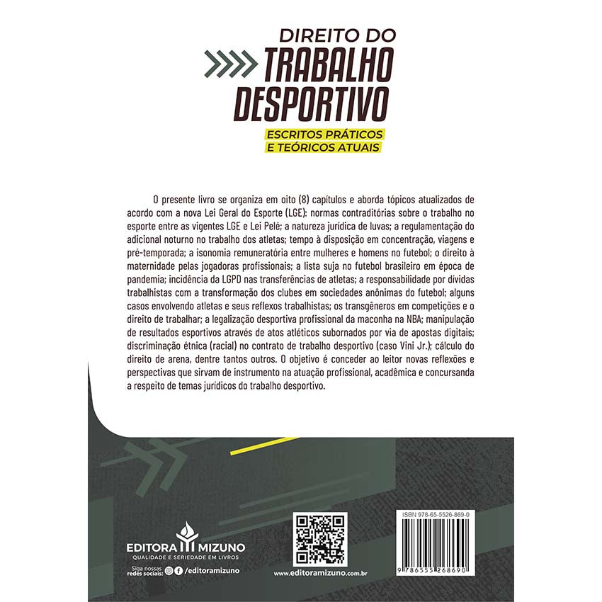 Direito do Trabalho Desportivo (2024), publicado pela Editora Mizuno, é uma obra essencial para profissionais, acadêmicos e estudiosos da área do direito desportivo. Escrito pelo renomado autor Rafael Teixeira Ramos, este livro oferece uma análise detalhada e atualizada sobre as complexidades jurídicas do trabalho no esporte, considerando as mais recentes alterações legislativas.