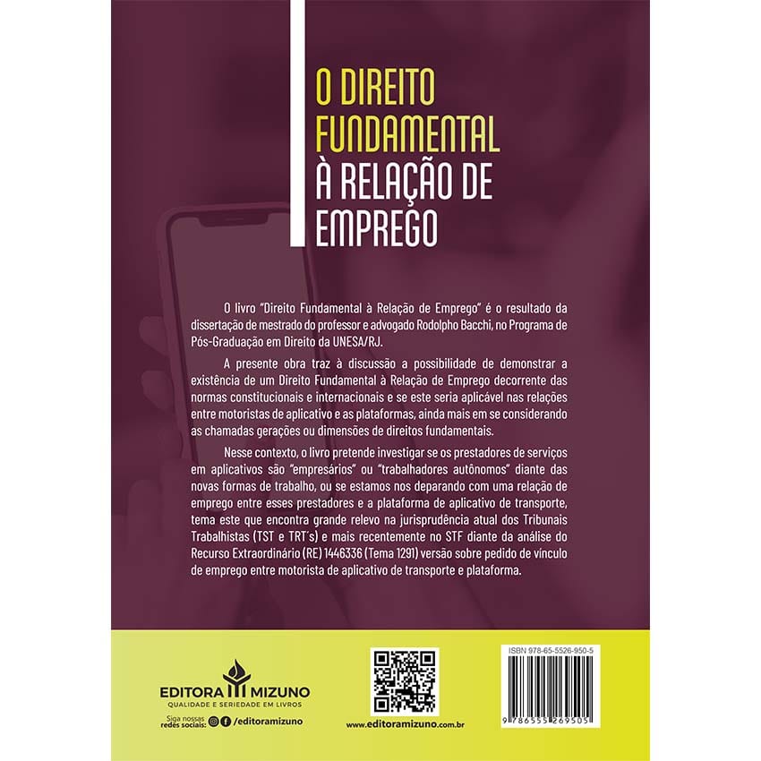 O livro O Direito Fundamental à Relação de Emprego, publicado pela Editora Mizuno, é o resultado da dissertação de mestrado do professor e advogado Rodolpho Cézar Aquilino Bacchi. Nesta obra, Bacchi discute a possibilidade de reconhecer a existência de um direito fundamental à relação de emprego, a partir de normas constitucionais e internacionais. O livro se aprofunda na análise de como este direito seria aplicável às novas formas de trabalho, especialmente aquelas envolvendo motoristas de aplicativo e plataformas digitais, um tema que ganha cada vez mais relevância nas discussões jurídicas e na jurisprudência trabalhista no Brasil.