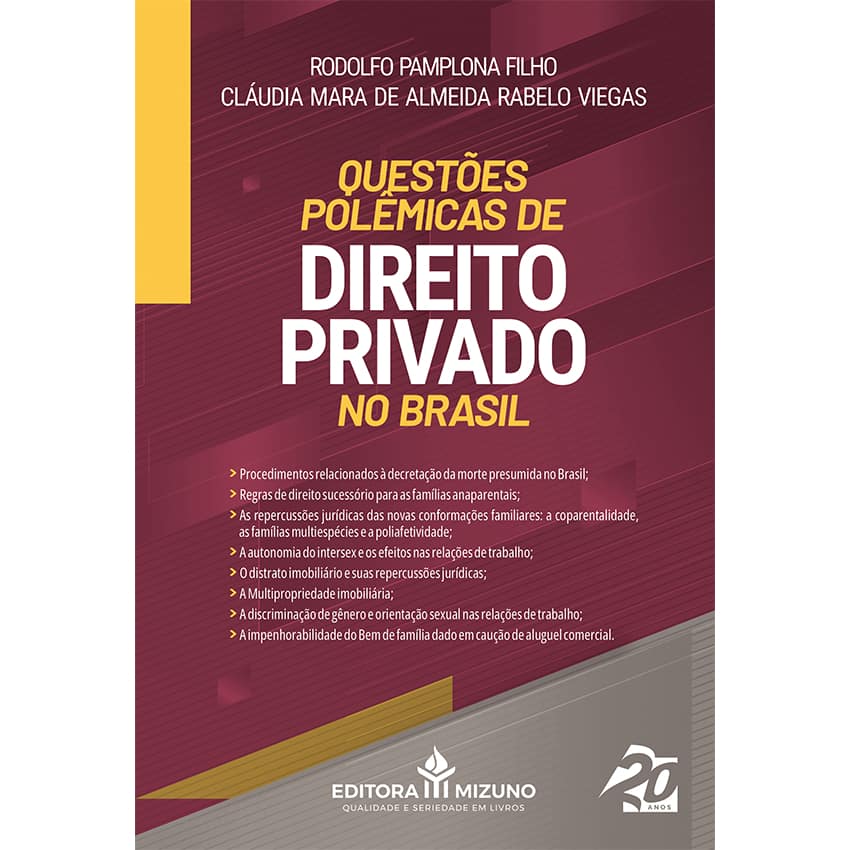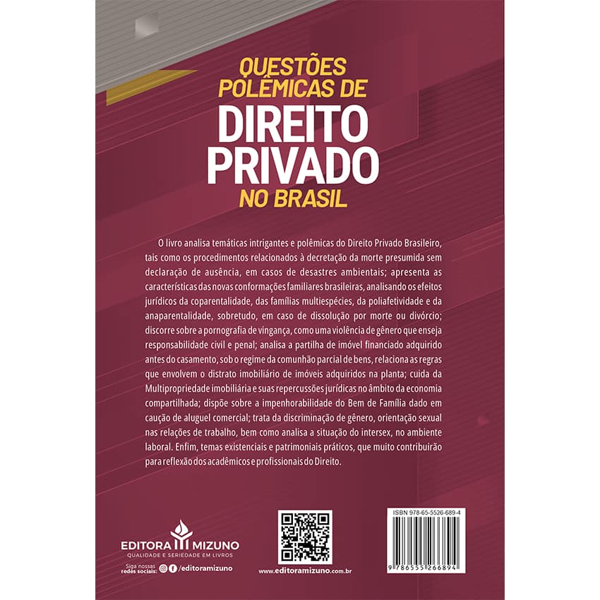 O livro analisa temáticas intrigantes e polêmicas do Direito Privado Brasileiro, tais como os procedimentos relacionados à decretação da morte presumida sem declaração de ausência, em casos de desastres ambientais; apresenta as características das novas conformações familiares brasileiras, analisando os efeitos jurídicos da coparentalidade, das famílias multiespécies, da poliafetividade e da anaparentalidade, sobretudo, em caso de dissolução por morte ou divórcio; discorre sobre a pornografia de vingança, como uma violência de gênero que enseja responsabilidade civil e penal; analisa a partilha de imóvel financiado adquirido antes do casamento, sob o regime da comunhão parcial de bens, relaciona as regras que envolvem o distrato imobiliário de imóveis adquiridos na planta; cuida da Multipropriedade imobiliária e suas repercussões jurídicas no âmbito da economia compartilhada; dispõe sobre a impenhorabilidade do Bem de Família dado em caução de aluguel comercial; trata da discriminação de gênero, orientação sexual nas relações de trabalho, bem como analisa a situação do intersex, no ambiente laboral.