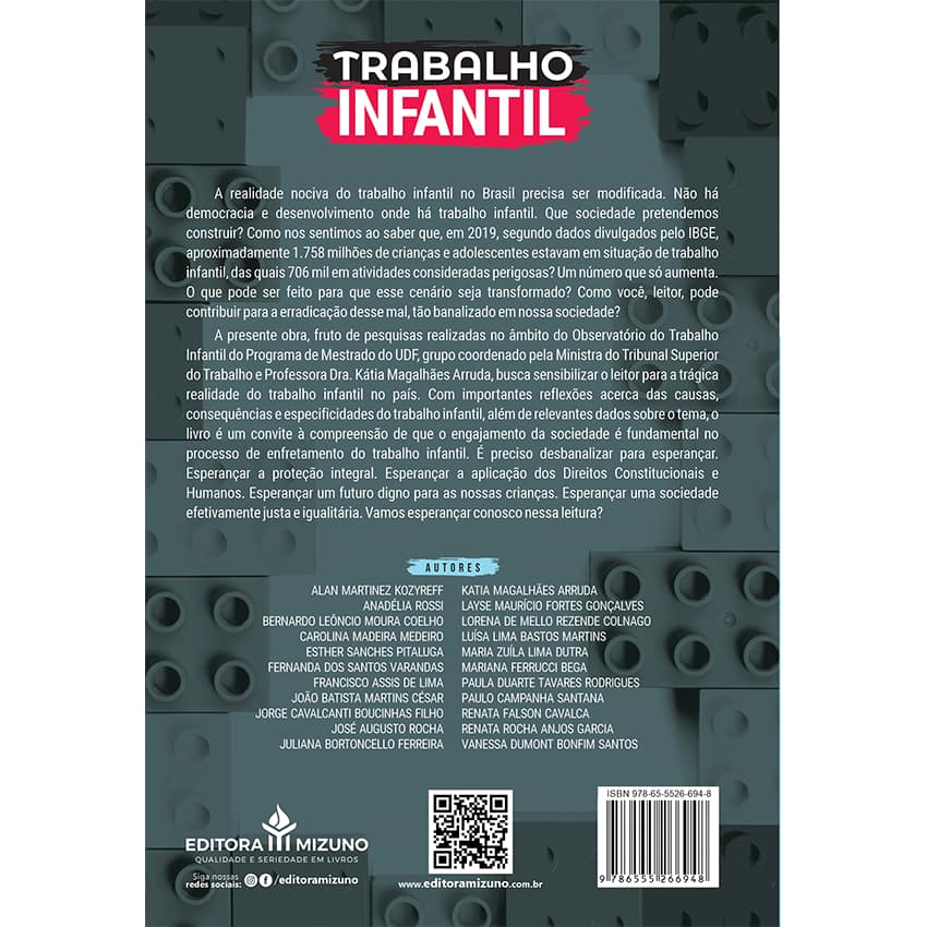 A presente obra, fruto de pesquisas realizadas no âmbito do Observatório do Trabalho Infantil do Programa de Mestrado do UDF, grupo coordenado pela Ministra do Tribunal Superior do Trabalho e Professora Dra. Kátia Magalhães Arruda, busca sensibilizar o leitor para a trágica realidade do trabalho infantil no país. Com importantes reflexões acerca das causas, consequências e especificidades do trabalho infantil, além de relevantes dados sobre o tema, o livro é um convite à compreensão de que o engajamento da sociedade é fundamental no processo de enfretamento do trabalho infantil. É preciso desbanalizar para esperançar. Esperançar a proteção integral. Esperançar a aplicação dos Direitos Constitucionais e Humanos. Esperançar um futuro digno para as nossas crianças. Esperançar uma sociedade efetivamente justa e igualitária.