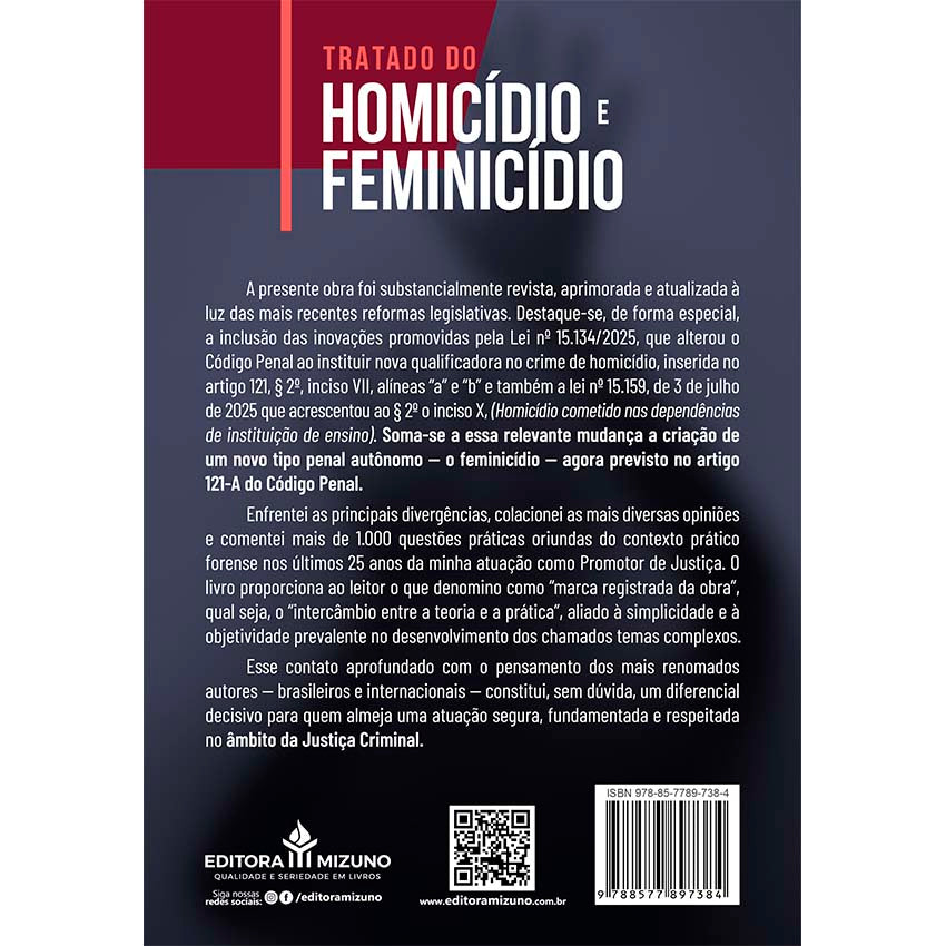 A presente obra foi substancialmente revista, aprimorada e atualizada à luz das mais recentes reformas legislativas. Destaque-se, de forma especial, a inclusão das inovações promovidas pela Lei nº 15.134/2025, que alterou o Código Penal ao instituir nova qualificadora no crime de homicídio, inserida no artigo 121, § 2º, inciso VII, alíneas “a” e “b” e também a lei nº 15.159, de 3 de julho de 2025 que acrescentou ao § 2º o inciso X, (Homicídio cometido nas dependências de instituição de ensino). Soma-se a essa relevante mudança a criação de um novo tipo penal autônomo — o feminicídio — agora previsto no artigo 121-A do Código Penal.
