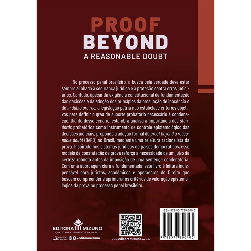 Em um cenário jurídico que exige cada vez mais rigor na fundamentação das decisões penais, a obra Proof Beyond a Reasonable Doubt - Uma Releitura do Standard de Prova Anglo-Saxão como Critério Racional para a Condenação no Processo Penal Brasileiro se apresenta como leitura indispensável. Escrito por Bruno Barcellos de Almeida e publicado pela Editora Mizuno, o livro promove um profundo estudo sobre os standards probatórios e a necessidade de critérios objetivos para a valoração das provas penais.