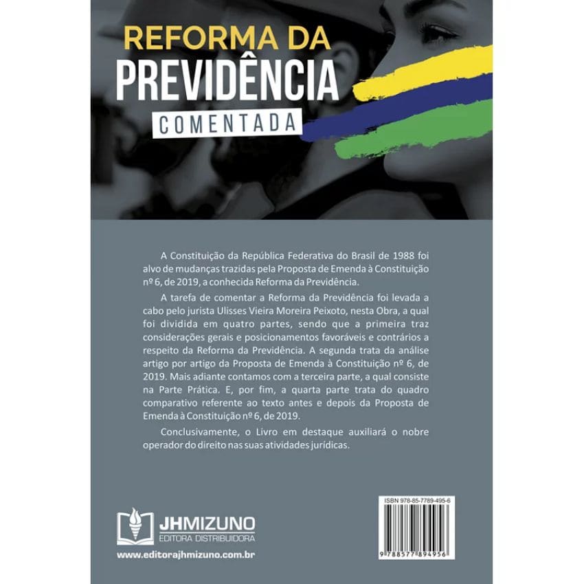 A tarefa de comentar a Reforma da Previdência foi levada a cabo pelo jurista Ulisses Vieira Moreira Peixoto, nesta Obra, a qual foi dividida em quatro partes, sendo que a primeira traz considerações gerais e posicionamentos favoráveis e contrários a respeito da Reforma da Previdência. A segunda trata da análise artigo por artigo da Proposta de Emenda à Constituição nº 6, de 2019. Mais adiante contamos com a terceira parte, a qual consiste na Parte Prática. E, por fim, a quarta parte trata do quadro comparativo referente ao texto antes e depois da Proposta de Emenda à Constituição nº 6, de 2019.
