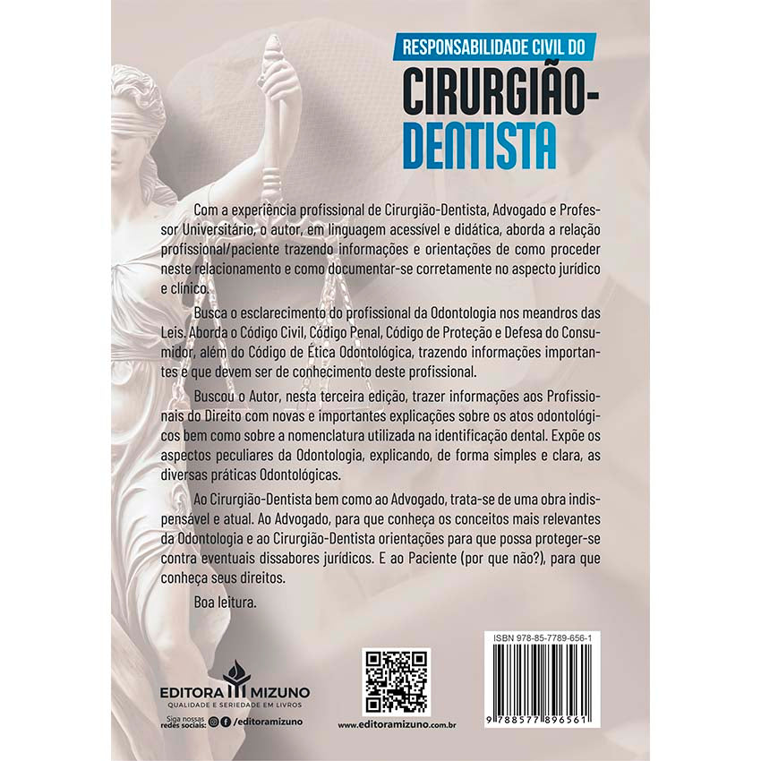 O livro Responsabilidade Civil do Cirurgião-Dentista - 3ª edição (2025), de autoria de Artur Cristiano Arantes, publicada pela Editora Mizuno, consolida-se como referência indispensável para profissionais da Odontologia e do Direito que desejam compreender os limites e as obrigações legais no exercício da atividade odontológica. Com uma abordagem clara, didática e técnica, o livro aborda os principais aspectos jurídicos que permeiam a relação profissional-paciente e os riscos inerentes à prática odontológica.