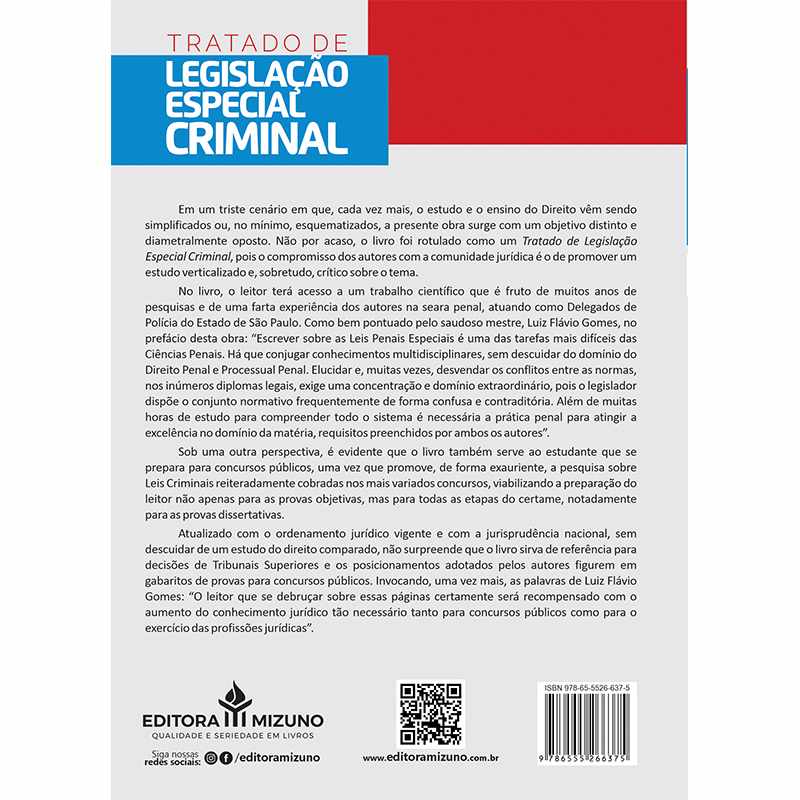 "Em um triste cenário em que, cada vez mais, o estudo e o ensino do Direito vêm sendo simplificados ou, no mínimo, esquematizados, a presente obra surge com um objetivo distinto e diametralmente oposto. Não por acaso, o livro foi rotulado como um Tratado de Legislação Especial Criminal, pois o compromisso dos autores com a comunidade jurídica é o de promover um estudo verticalizado e, sobretudo, crítico sobre o tema.