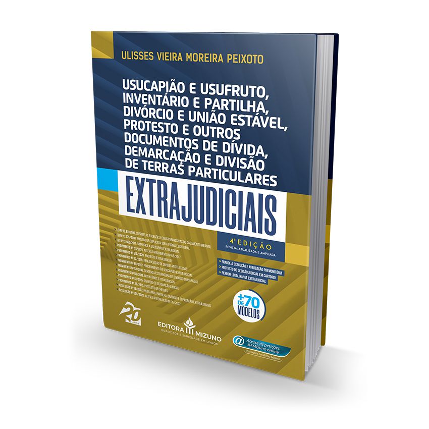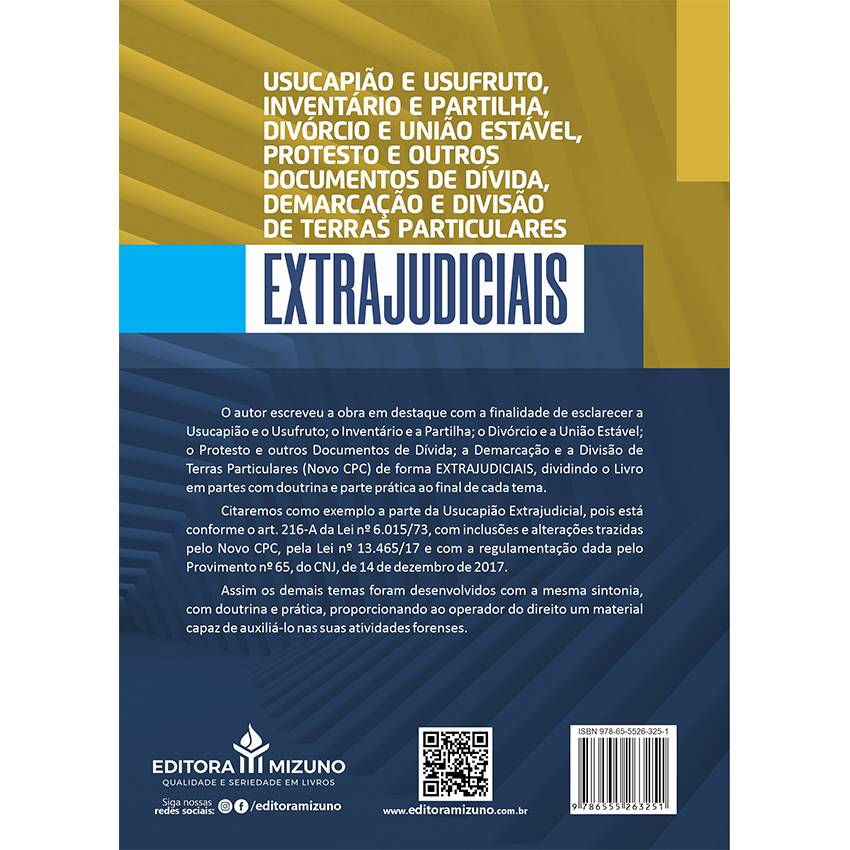 Sinopse: O autor escreveu a obra em destaque com a finalidade de esclarecer a Usucapião e o Usufruto; o Inventário e a Partilha; o Divórcio e a União Estável; o Protesto e outros Documentos de Dívida; a Demarcação e a Divisão de Terras Particulares (Novo CPC) de forma EXTRAJUDICIAIS, dividindo o Livro em partes com doutrina e parte prática ao final de cada tema.